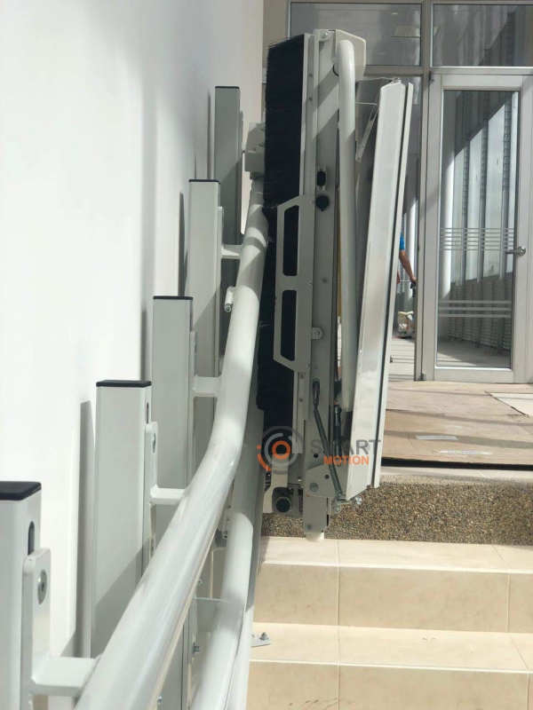 desde los mandos de piso. En la posición de aparcamiento, el salva escaleras no obstruye el paso de la escalera gracias a su cierre automático de brazos y plataforma.